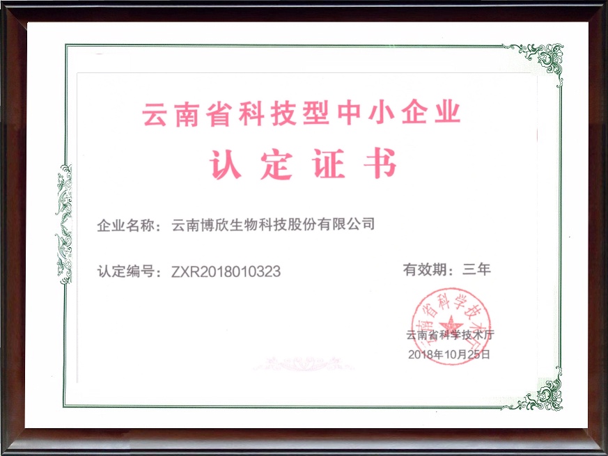 YunnanBoxinBiotechCo.,LtdobtainedTheCertificationCertificateofYunnanProvinceSmallandMedium-sizedscientificandtechnologicalent...